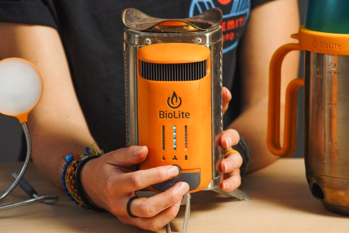 The BioLite CampStove 2+ is an outdoor cooking device that uses wood as its primary fuel source. It is designed to burn twigs, pine cones, and other small pieces of biomass, converting heat into electricity through a thermoelectric generator. This process powers an integrated fan that improves combustion efficiency, reducing smoke compared to traditional campfires.